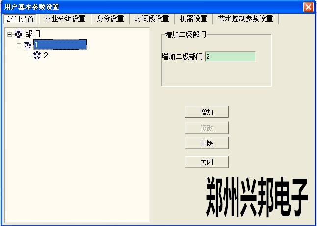 打開485售飯機軟件--系統管理--用戶參數設置--用戶基本參數設置--部門,打開后點擊部門,可以添加一級部門,然后再把光標點到一級部門上,此時可以添加二級部門,如下圖所示