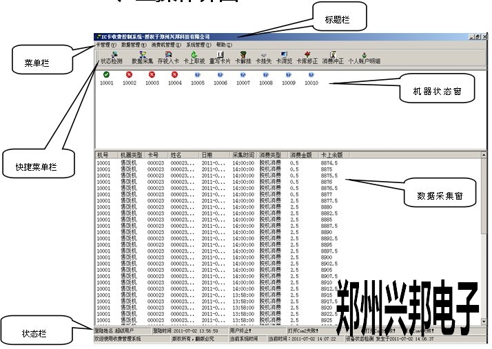 4)數(shù)據(jù)采集窗口用于查看數(shù)據(jù)的采集情況,在進(jìn)行消費(fèi)的時(shí)候,最好不要對(duì)收費(fèi)機(jī)進(jìn)行數(shù)據(jù)采集,我們不建議邊消費(fèi)邊采集數(shù)據(jù)