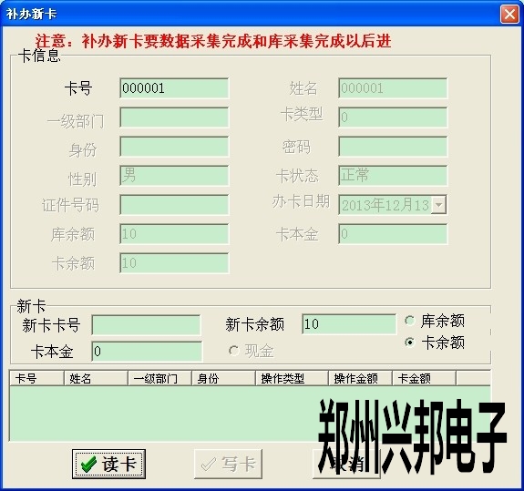 3. 此時先在軟件中把000001這張卡掛失了,然后點卡管理--補辦新卡(確保數據全部采集完),打開對話框后輸入卡號按回車鍵,當出現卡信息后,把編號為000001的這張卡放到讀卡器上點讀卡,然后點確定即可。