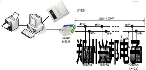 采用485通訊方式,如圖:485通訊須要自助轉賬機與電腦之間連線、距離不能超過1200米,自助轉賬機可以設在充值點旁邊,或食堂內。