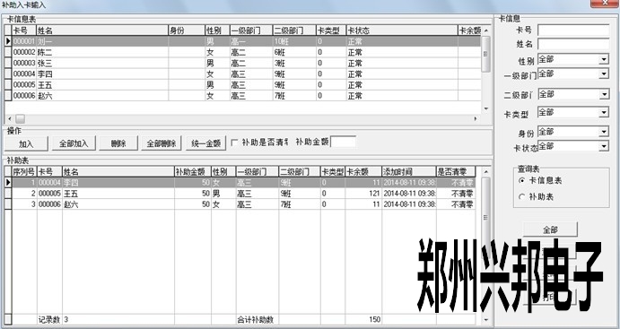1.485軟件打開后,點(diǎn)一下卡管理--補(bǔ)助入卡--補(bǔ)助入卡輸入,打開補(bǔ)助入卡輸入窗口,在右卡信息中輸入想要添加的人員條件后,點(diǎn)擊下面的查詢,然后在左邊的補(bǔ)助金額后面的框中填寫補(bǔ)助金額,可以選擇是否清零,若選擇補(bǔ)助清零,在領(lǐng)取補(bǔ)助時(shí)會(huì)將卡上的金額先清零再補(bǔ)助上此次的金額;若選擇不清零,則在領(lǐng)取補(bǔ)助時(shí)會(huì)累加之前卡上的金額。點(diǎn)擊全部加入,就給選出來的人員生成補(bǔ)助.關(guān)閉此畫面,如下圖所示。