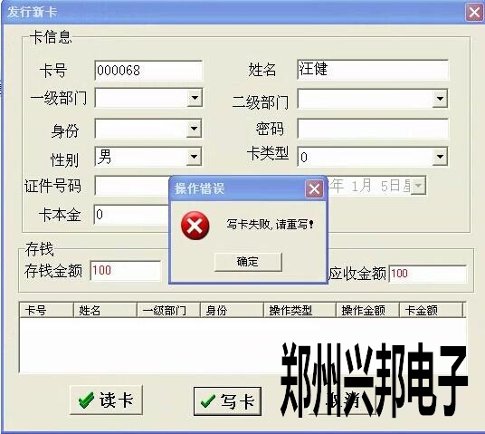問題描述:客戶用的485食堂售飯機軟件,軟件可以正常打開,正常讀卡,客戶卡也能正常使用,發行新卡,存款時讀卡的時候是正常的,但是在寫卡的時候一直提示寫卡失敗,請重寫!