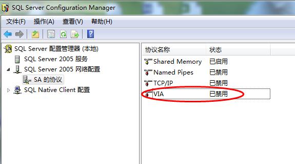 4、打開SQL Server 2005中的配置工具SQL Server Configure Manager,將VIA協(xié)議禁用